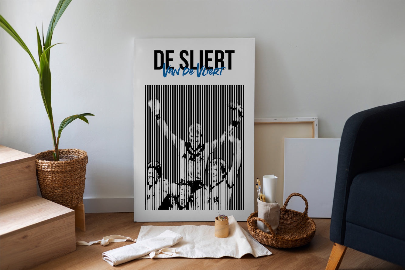 Breng een iconisch moment in de sportgeschiedenis tot leven met deze unieke kunstplaat uit de "Moment in Stripes" collectie. In deze print zie je hoe Jan van Grinsven, ook wel bekend als ‘De Sliert van De Vliert’, op de schouders wordt getild nadat hij als keeper scoorde voor FC Den Bosch.