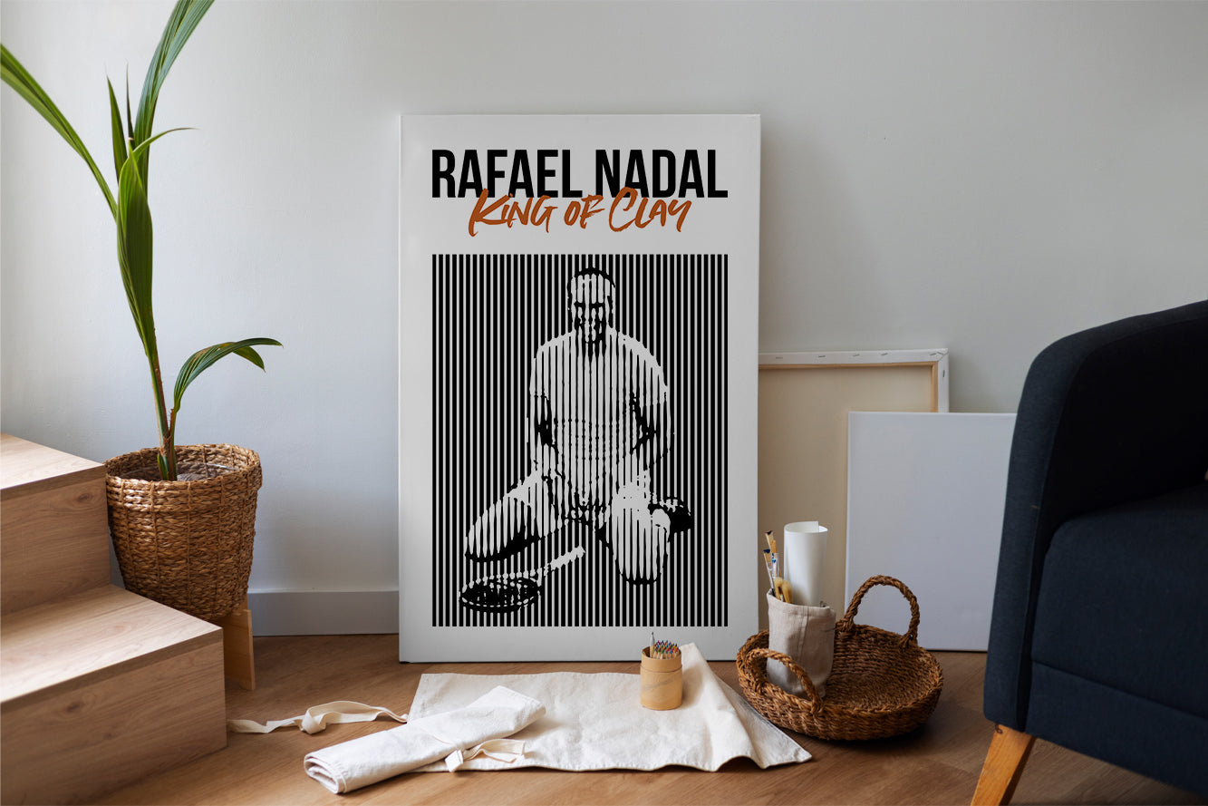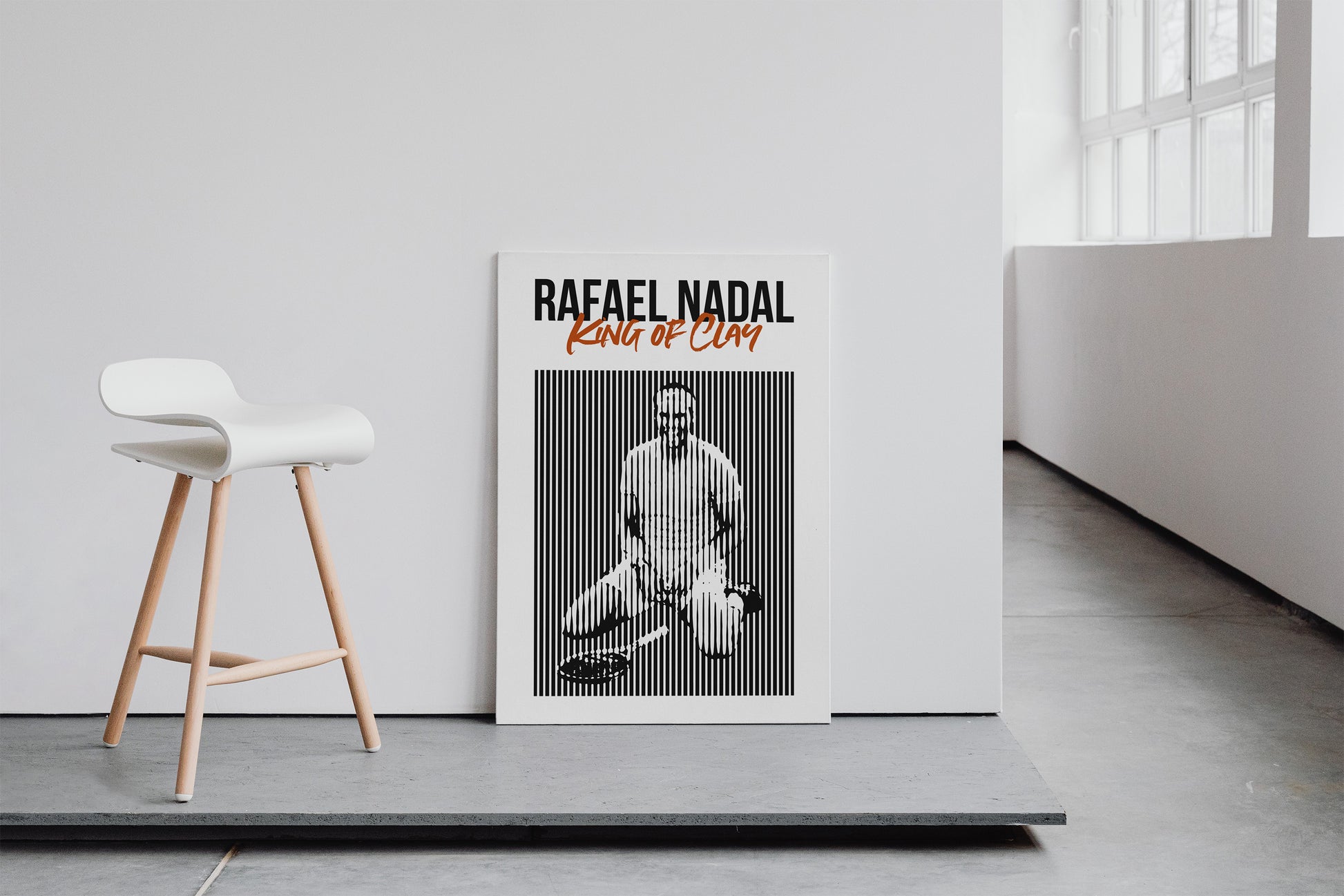 Breng een iconisch moment in de sportgeschiedenis tot leven met deze unieke kunstplaat uit de "Moment in Stripes" collectie. Dit design brengt een ode aan Rafael Nadal, die zich met 13 Roland Garros-titels met recht de Koning van de Gravel mag noemen.