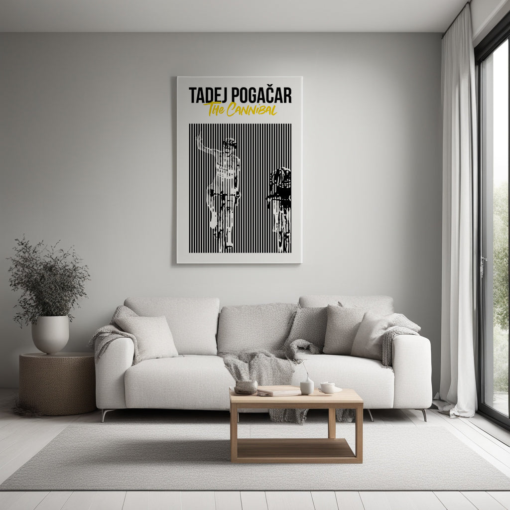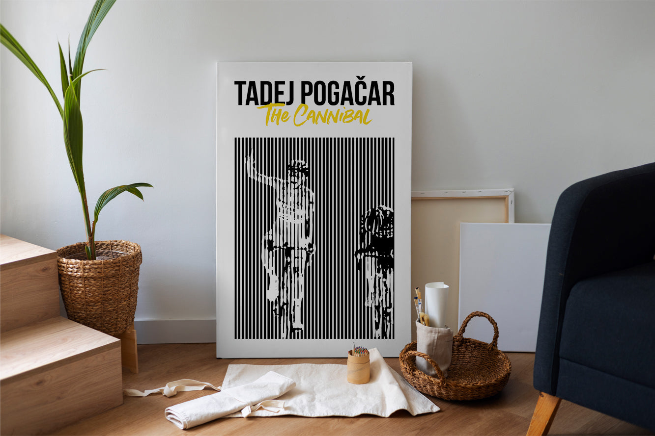 Breng een iconisch moment in de sportgeschiedenis tot leven met deze unieke kunstplaat uit de "Moment in Stripes" collectie. Deze plaat illustreert het historische jaar 2024 van Tadej Pogacar, waarin hij domineerde in zowel de Giro d’Italia als de Tour de France en zich een ware kannibaal toonde.